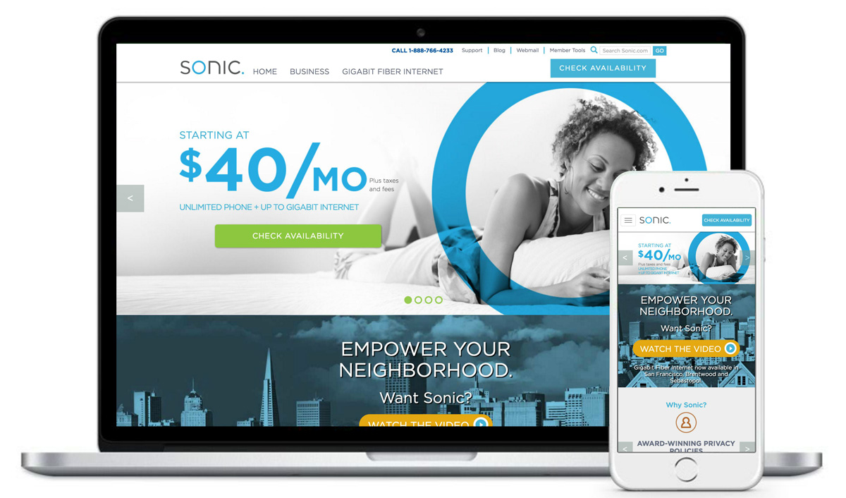Sonic is disrupting conventional industry practices with top-ranked customer service, an unlimited-internet/home phone ‘Fusion’ service that does away with data caps, a rapidly expanding Gigabit Fiber consumer network, and user-friendly B-to-B net services. Kiosk is currently bringing the message of faster speeds and better customer service via highly attributable channels, like SEM and paid social marketing (yes, we’re helping Sonic sell their internet services on the internet).