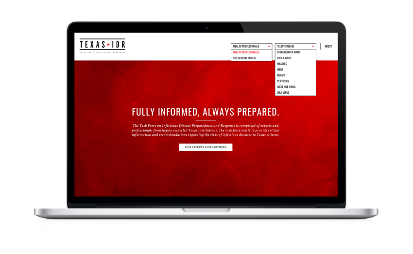 The Texas Task Force on Infectious Disease Preparedness and Response is a statewide group of health professionals and educators assembled by the Governor of Texas with the purpose of sharing educational resources on infectious diseases, such as Ebola, MERS, and Measles. During the Ebola crisis of 2014/2015, Kiosk was tasked with developing a brand identity for TexasIDR (short for Texas Infectious Disease Readiness), in addition to developing an online presence that would serve as a reliable resource for health professionals and the public.
