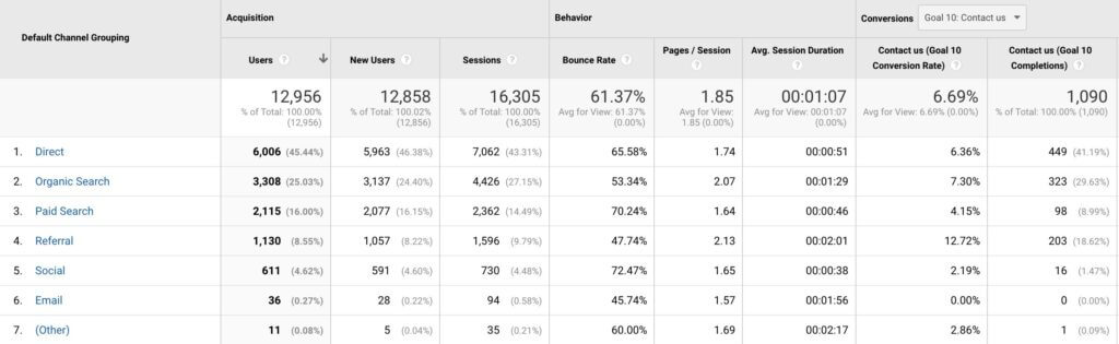- Acquisition > Channels: filter for known conversion points that are reliably tracked, generally this will be inquiry form submits or purchases if you have ecommerce enabled.