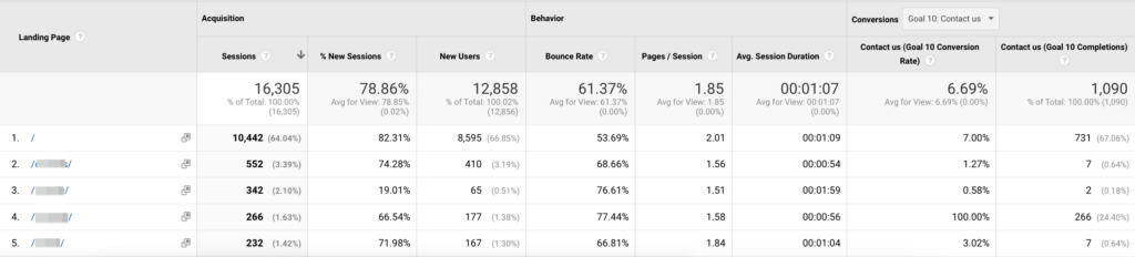 - Behavior > Site Content > Landing pages (including conversions)