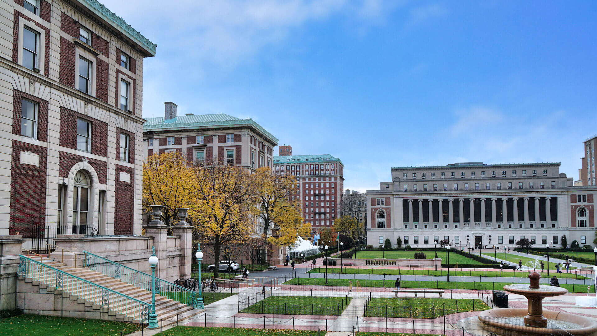 Large university campus with Romanesque style buildings, Columbia University in New York