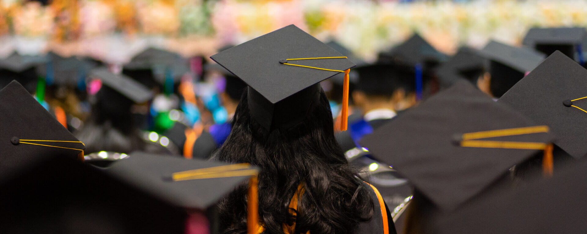 Rear view and soft selective focus of the graduates in the graduation commencement ceremony recieving diploma degree certificate.