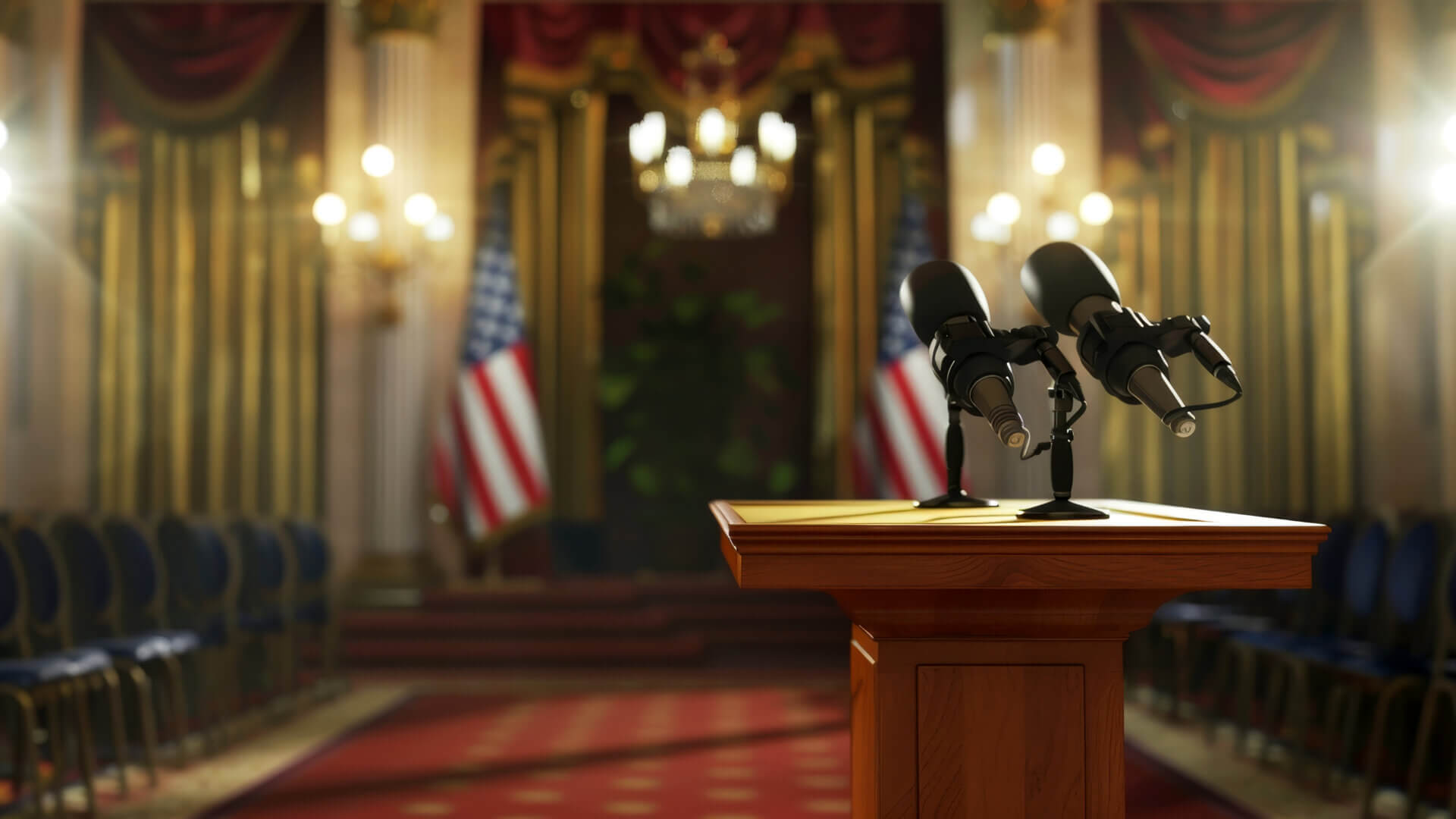Government official addressing media on economic recovery plans, podium and press backdrop, indoor setting, copy space,