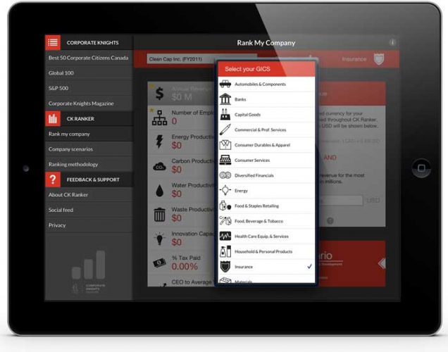Here at Kiosk, we proudly promote green and sustainable business practice at all of our offices and are delighted when we see other companies doing the same thing. We recently stumbled across Corporate Knights, a Toronto-based company “focused on quantifying and animating clean capitalism drivers for decision makers,” created the CK Ranker. An app that not only lets you look at information about existing companies around the world, but allows you to add your own company’s ingredients and see how you measure up against the competition.