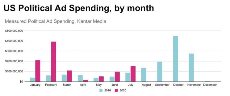 The election cycle got off to an unprecedented start, with Democratic candidates Bloomberg and Steyer burning through a combined $600 million during their presidential primary runs. This vastly inflated month-by-month spending figures in the early part of the year, when compared to 2016.