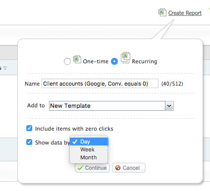 Of course, having the right alerts matters too. Spend a little time defining a list of alerts that are important for you, and set up recurring alerts that will fire when your data meets the criteria. This frees you up to focus on strategy with your account and triage the problems that pop up from alerts as they come in.