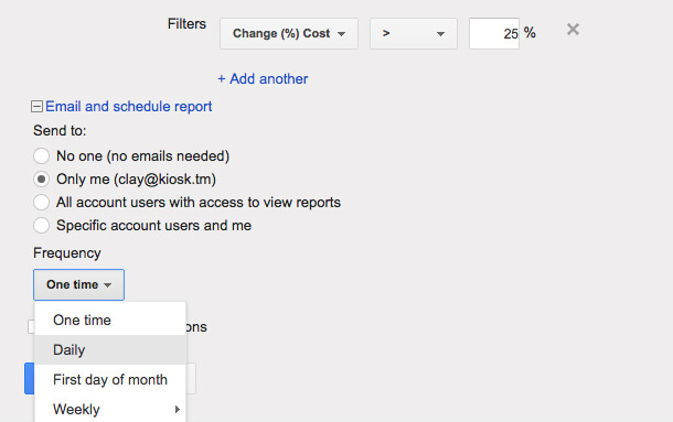 Being a successful SEM manager means managing your time well, so you can manage your accounts properly. Setting up alerts can save you time and your client money, by bubbling up important changes in account performance automatically, and sending the info directly to your inbox each morning. They keep you from having to run ad hoc reporting, filtering through spreadsheets or adjusting columns in a table on a website platform. You can set up alerts in bid platforms like Marin Software and DoubleClick, or directly in the publisher interfaces (Google AdWords or Bing Ads).